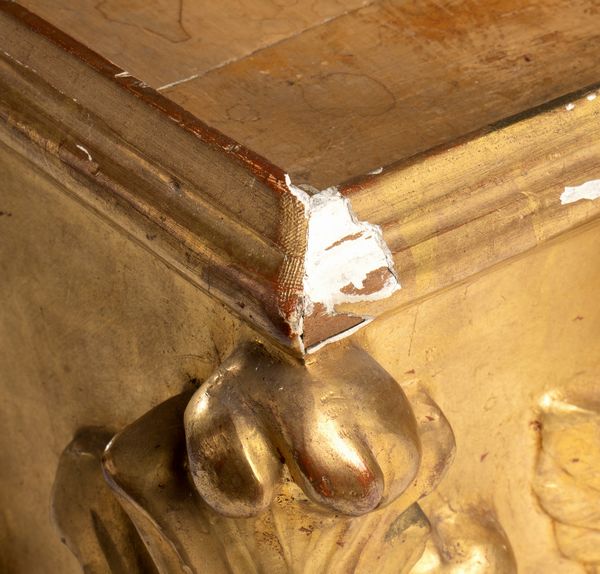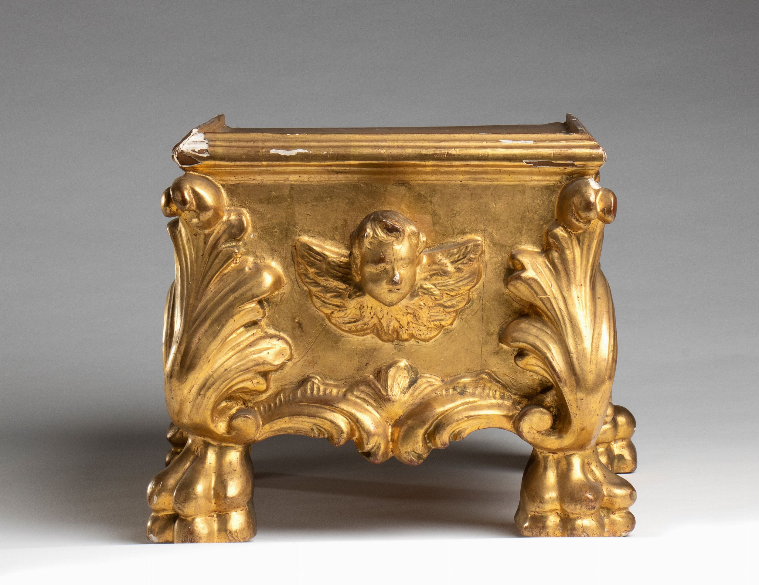 Roma, XVIII secolo in legno dorato intagliato a motivi floreali e con un putto sul fronte; piedi ferini.