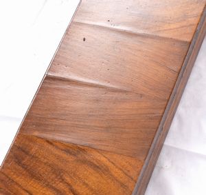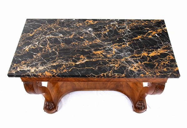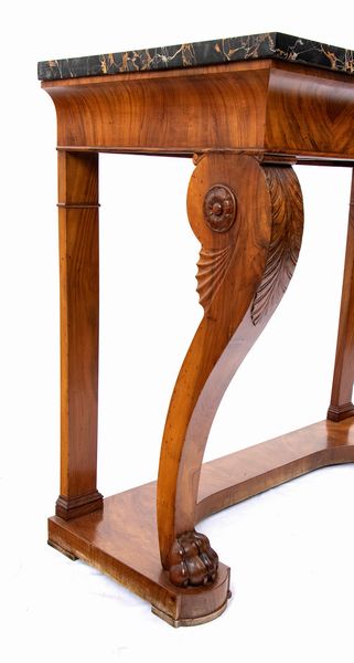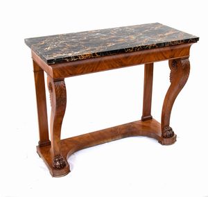 Altezza x larghezza x profondità 93x 115x 55 cm XIX secolo lastronata in noce, piano in marmo di forma rettangolare, fascia liscia, sostegni posteriori diritti e anteriori in foggia di grande voluta rivolta verso l'interno ornata nella parte superiore da foglie d'acanto nella parte frontale e rosoni laterali, piedi a zampa ferita, pedana sagomata.