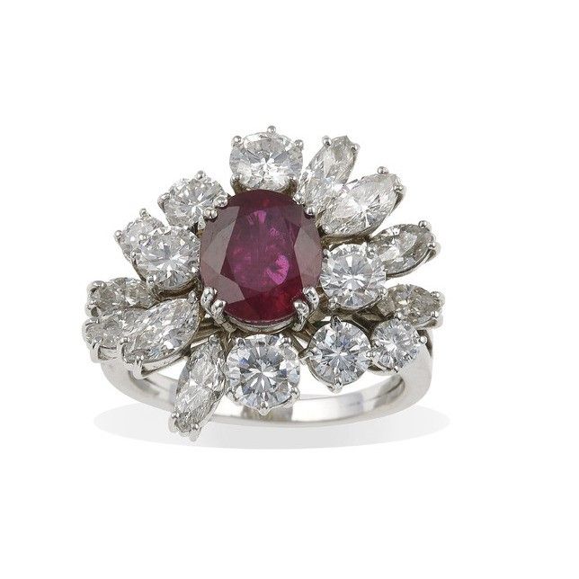 Anello con rubino Thailandia, evidenze di trattamento termico, e diamanti
