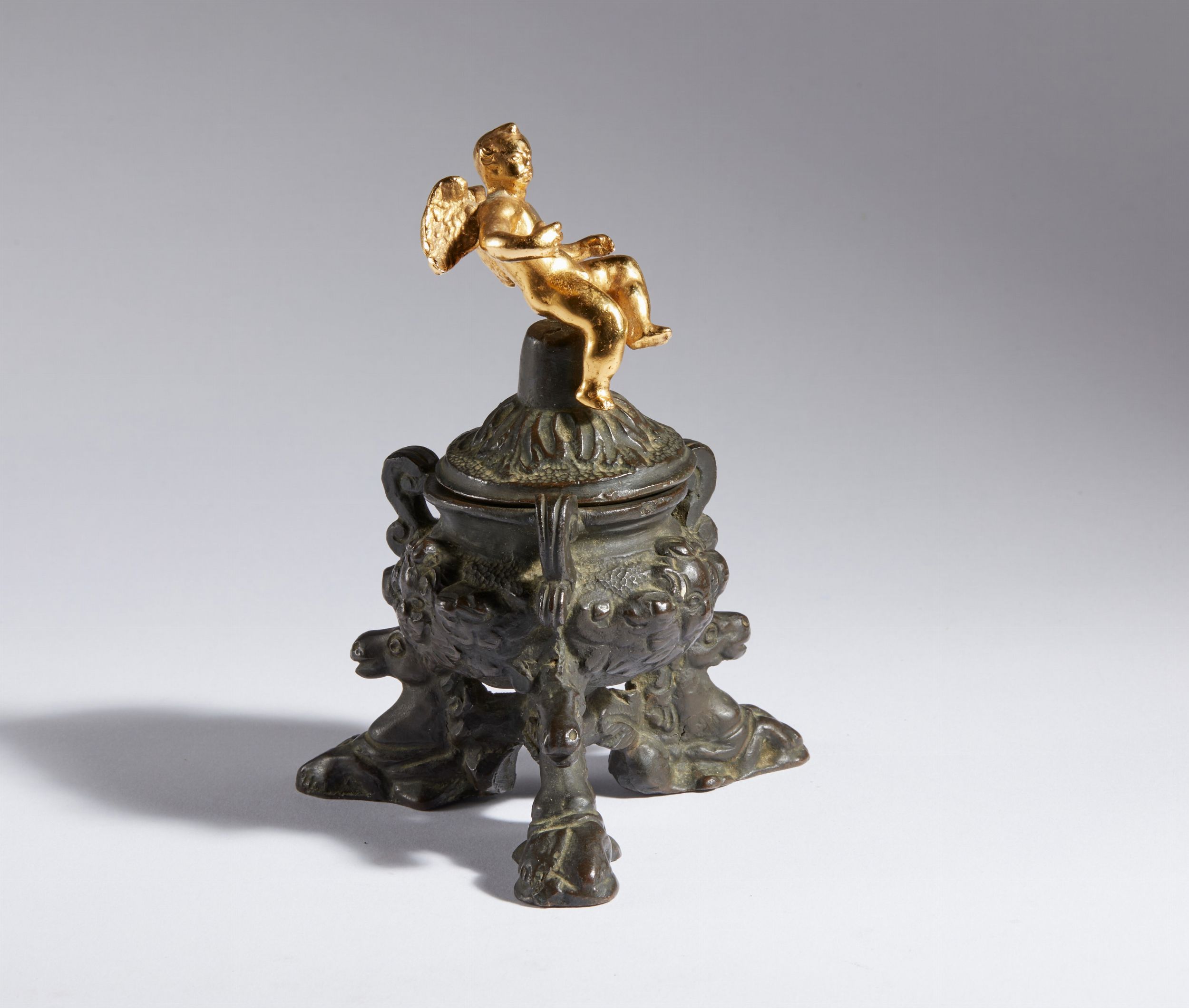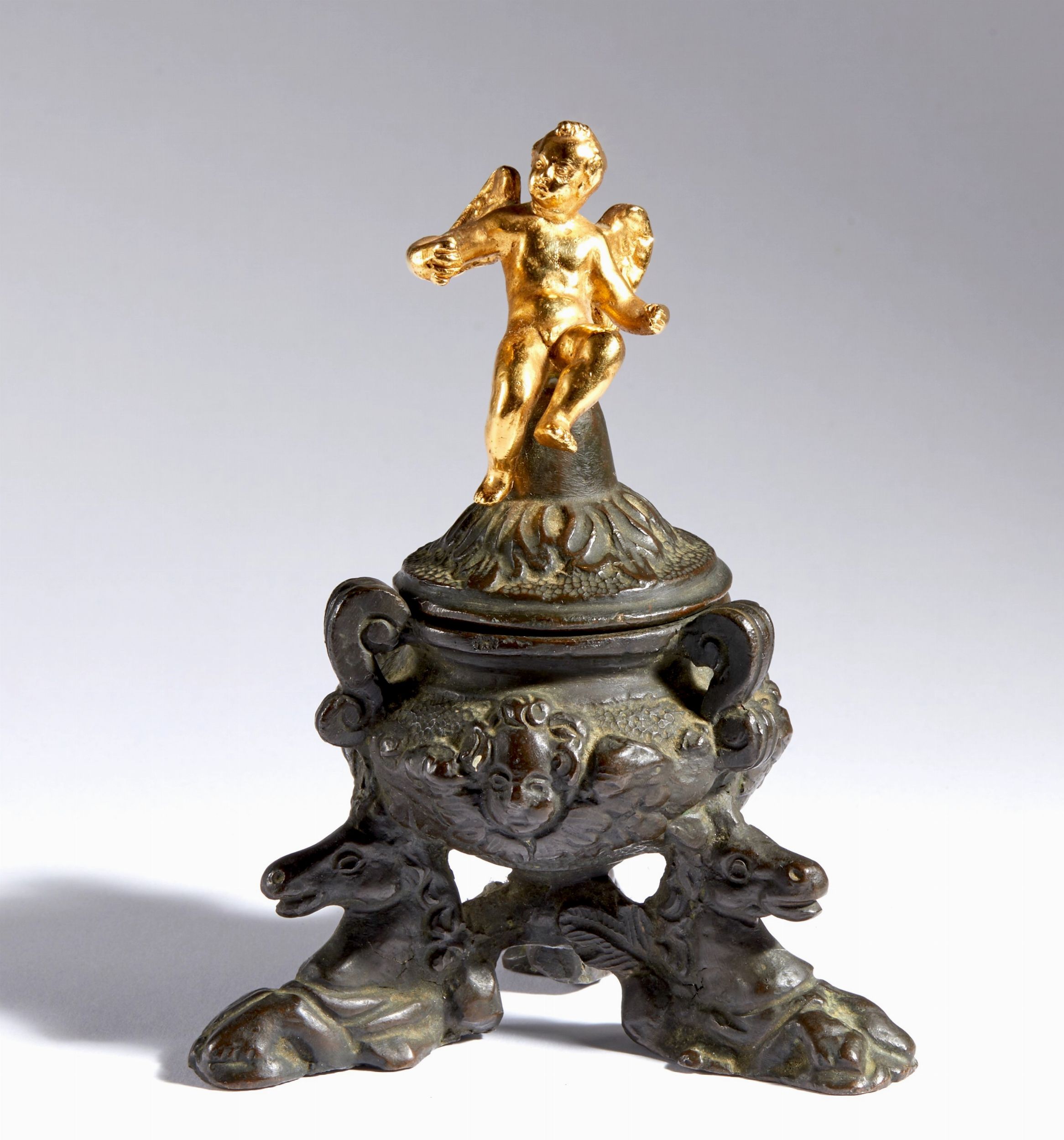 Bronzo patinato nero e dorato; 15x11x10,5 cm. Questo calamaio viene attribuito alla fonderia di Giuseppe de Levis, fonditore ebreo veronese. Un modello pressoché identico appartiene alla collezione Thyssen Bornemisza, schedato da Anthony Radcliffe come bottega di De Levis. Il corpo centrale presenta tre facce d' angelo divise da volute in aggetto e sorretto da altrettanti ippocampi. Sul tappo un amorino dorato al mercurio in perfette condizioni. La fusione ha poca lavorazione a freddo ed è piuttosto materica, ricoperta da una lacca nera, elemento distintivo dell' epoca a cui appartiene, il secolo XVII. Bibl. Charles Avery, Joseph de Levis & Company, Philip Wilson Publishers, London, 2016, p. 177. Anthony Radcliffe-Malcolm Baker-Michael Maek-Gerard, The Thissen Bornemitsza Collection Renaissance and Later Sculpture, Philip Wilson Publishers, London, 1992, pp. 234-237.