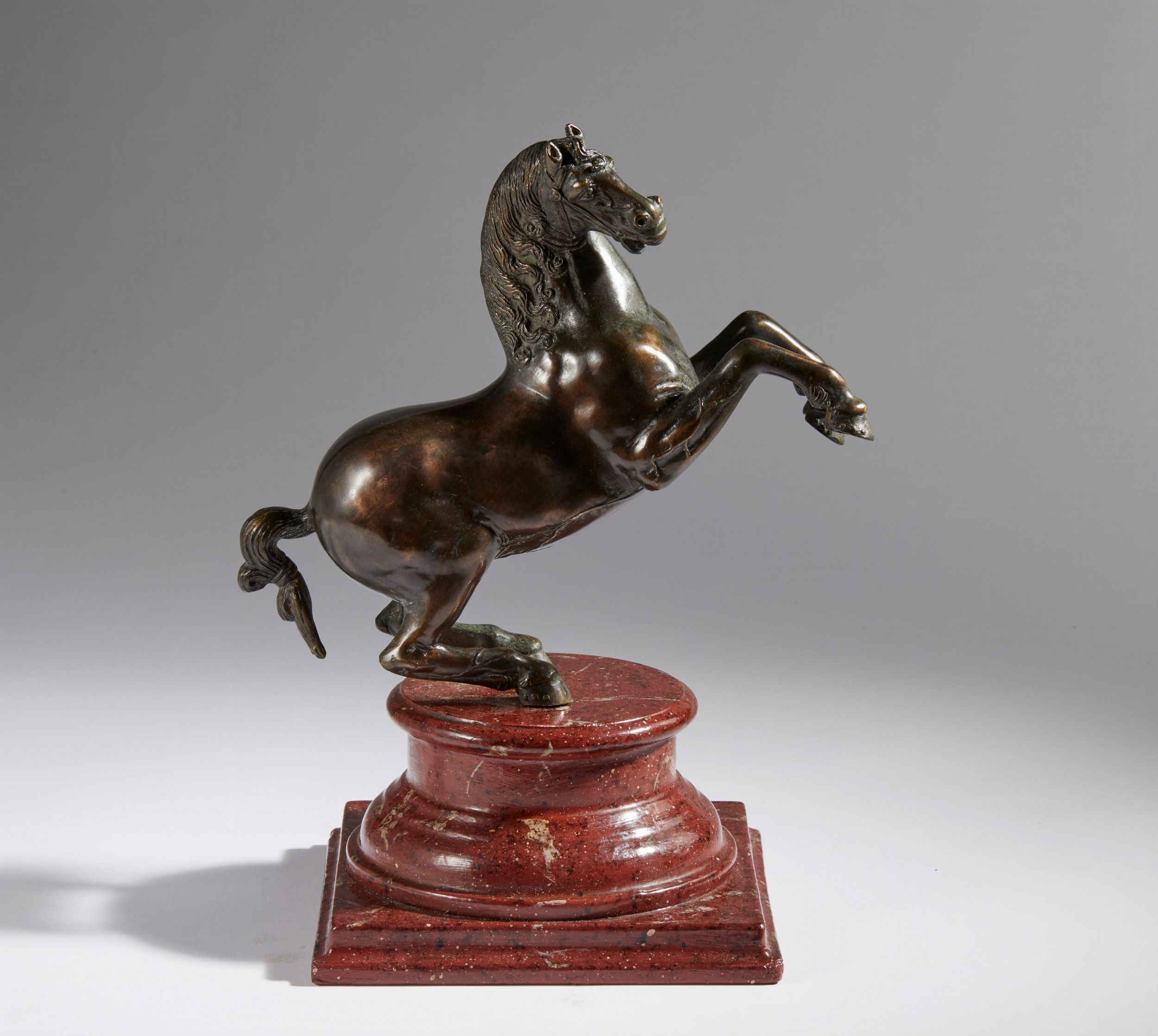 XVII-XVIII secolo Bronzo con patina trasparente rossastra; 32x25x8 cm Questo bel cavallo impennato deriva dai modelli dello scultore Francesco Fanelli. Nato a Firenze lavorò a Genova ed in seguito a Londra dove le sue opere furono molto apprezzate da Carlo I. Morì forse a Parigi. Bella fusione con patina trasparente rossastra tipica delle migliori produzioni fiorentine dal Rinascimento in poi. Il corpo è molto lavorato e lucido e presenta in evidenza le ramificazioni venose dell'animale. Il muso è ben modellato ed espressivo, stretto dai finimenti del morso che gli fanno spalancare la bocca e mostrare i denti. La criniera, poi, un capolavoro di cesello dove le lunghe ciocche si inseguono a formare nidi a vortice. La coda annodata con un fiocco alla maniera del monumento equestre del Gattamelata a Padova.