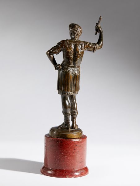 Scuola veneta?; XVI-XVII secolo Bronzo patinato, b ase in legno non coeva Misure con base: 36x14x8 Misure bronzo: 30x15x8 cm Questa bella statuetta raffigura un imperatore romano in lorica con un serto di alloro che gli cinge la testa. L'armatura è decorata a bulino con girali fogliacee simmetriche, sulle spalle due teste di leone. Riguardo a questo bronzo, si può fare un riferimento ad una statuetta conservata al Museo dell'Ermitage, che raffigura un imperatore romano, appunto, in lorica e con il serto di alloro in capo. Misure pressoché identiche e facente parte di una serie di imperatori giudicati rinascimentali. Si notino le somiglianze fra i due armigeri nell'armatura, nella postura e nella matericità della fusione. Oggetto di interesse particolare per la splendida patina traslucida naturale che emerge da quella artificiale originaria, più scura e bituminosa. Bella l'espressione volitiva e realistica del viso. Bibl. Sergej Androsov, Museo Statale Ermitage, La Scultura Italiana dal XIV al XVI secolo, Skira, Milano 2008, p.98.