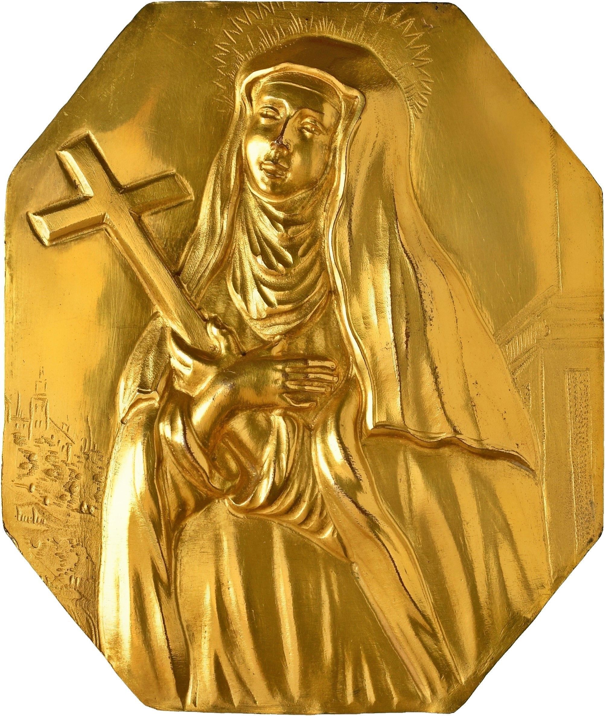 Santa Caterina da Siena in abito domenicano con aureola raggiante, tiene il crocifisso tra le mani. Sullo sfondo piccolo paesaggio inciso, sulla destra una struttura di palazzo. Splendido lavoro.