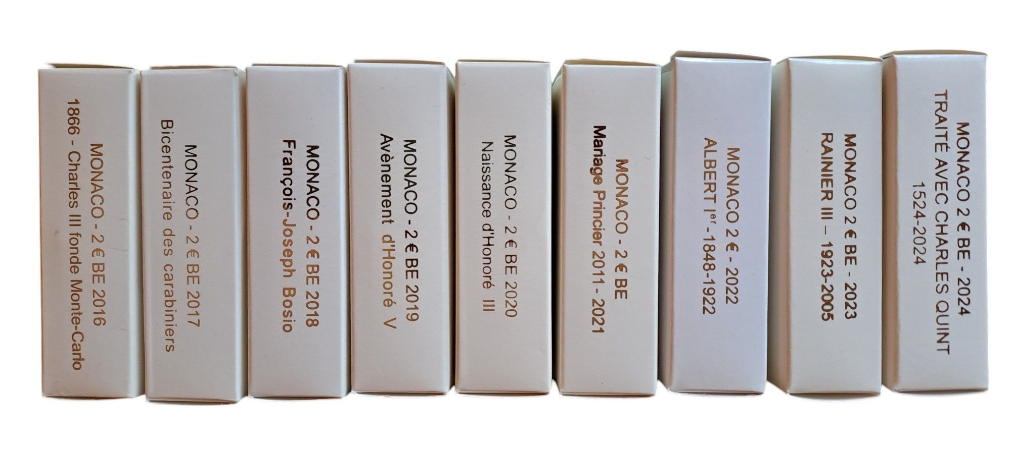 Monaco 2016 2024. Lotto di 9 monete da 2 Euro proof in astuccio.