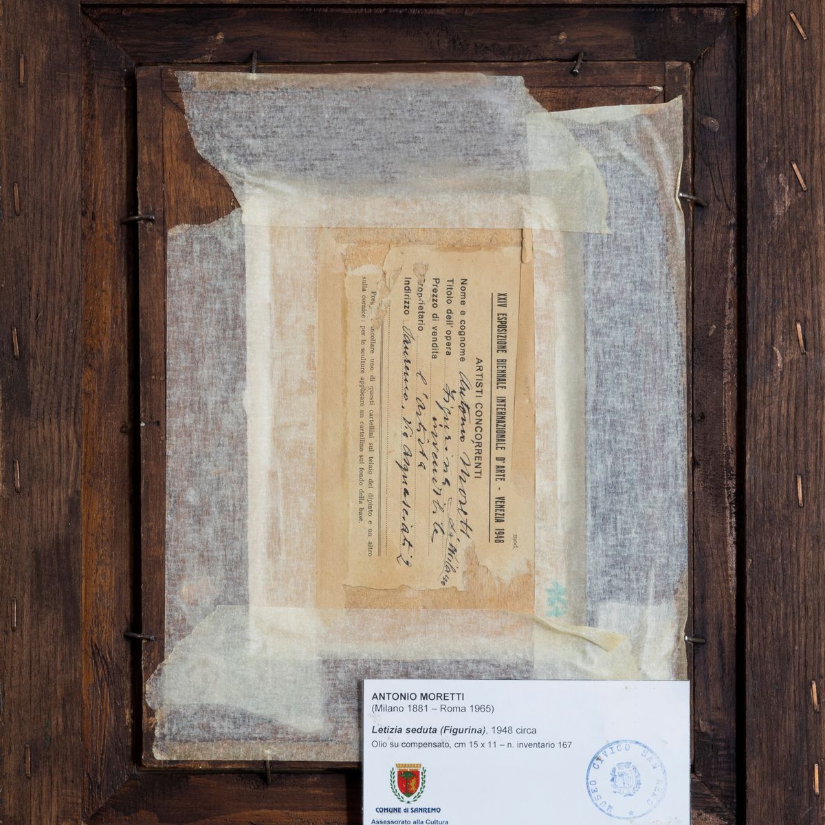 olio su legno, cm 15x11 firmato in basso a destra: Moretti al retro: cartellino della XXIV Esposizione Internazionale Biennale d'Arte - Venezia 1948 con riferimenti all'artista e all'opera e prezzo ( invendibile ); cartellino a stampa con riferimenti all'opera e timbro del Museo Civico di Sanremo in occasione della mostra Antonio Moretti. Un pittore milanese a Sanremo (21 marzo - 31 ottobre 2015).