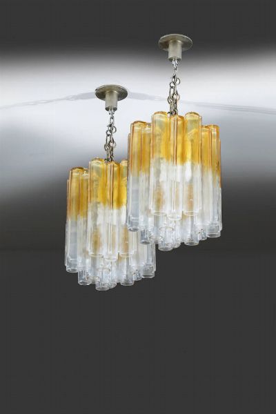 Struttura in metallo laccato ottone ed elementi in vetro colorato. Prod. Venini anni '70 h cm 78x32
