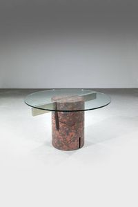 Struttura in cemento mimetico barra centrale in metallo e piano in vetro. Prod. Saporiti anni '70 cm 72x128x128 [..]