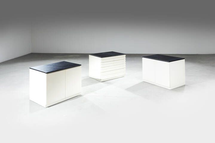 Struttura in legno laccato. piano rivestito in pelle. Prod. Poggi anni '60 singolo modulo cm 56 5x72x54 Bibl.: R. Dulio F. Marino S.A. Poli Il mondo di Poggi. L'officina del design e delle arti Electra Milano 2019 pag.129 Piccoli difetti