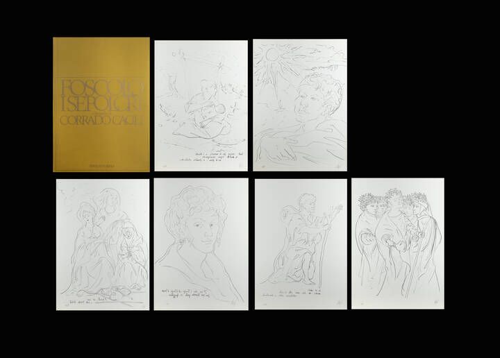 70x50 litografia es. 16/75 Ciascuna firmata in basso a destra e numerata in basso a sinistra a matita; timbro a secco di Espolito Torino nell'angolo in basso a sinistra Cartella di 6 litografie ispirate a I Sepolcri di Ugo Foscolo con presentazione di Giuseppe Marchiori