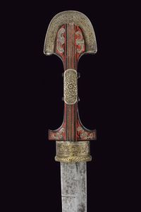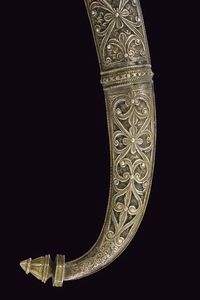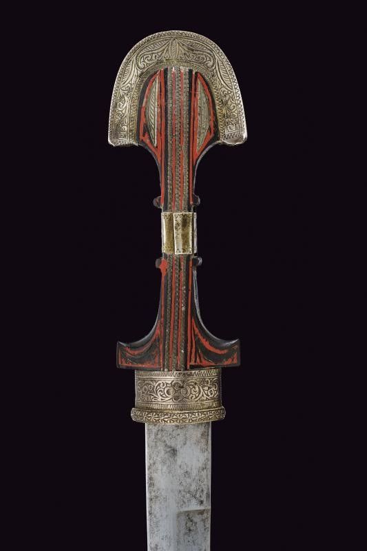 Marocco, lunghezza 38.5 cm. 1900 circa Robusta lama a un filo e controfilo, impugnatura in legno riccamente decorata con fornimenti e tarsie in argento, resti di smalti rossi. Bel fodero in argento riccamente inciso a motivi floreali, due grandi anelli di sospensione. Raro in questa qualità.