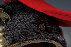 Prussia, altezza 12.5 cm. 1910 circa Corpo rivestito di pelliccia nera con imperiale rosso. Sul frontale grande fregio a teschio con tibie incrociate sormontato dal bandeau 'Mit Gott für König und Vaterland'. Soggolo mancante. Completo del cordone e feldzeichen in tessuto. Fodera in pelle all'interno. Raro.