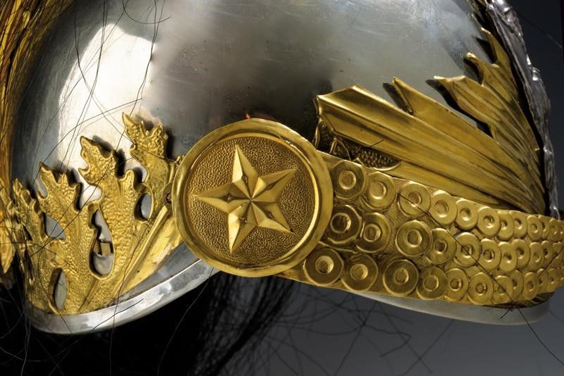 Repubblica Italiana, altezza 30 cm. 1947 circa Coppo in alpacca con fornimenti in ottone ben dorato, cimiero con tipici decori stampati in rilievo, ceffo a teste di leone con coda nera. Oliva con stella, raggiera dorata sormontata da trofeo d'armi in metallo argentato. Tipici soggoli a squame con orecchioni tondi con stella; coccarda tricolore in cotone, pennacchio originale rosso e bianco. Interno con visiere in marocchino bruno, alluda in coietto chiaro lavorato a spicchi. Il coppo marcato sotto il cimiero con il punzone di Eugenio Capriolo, capo armaiolo dei corazzieri.