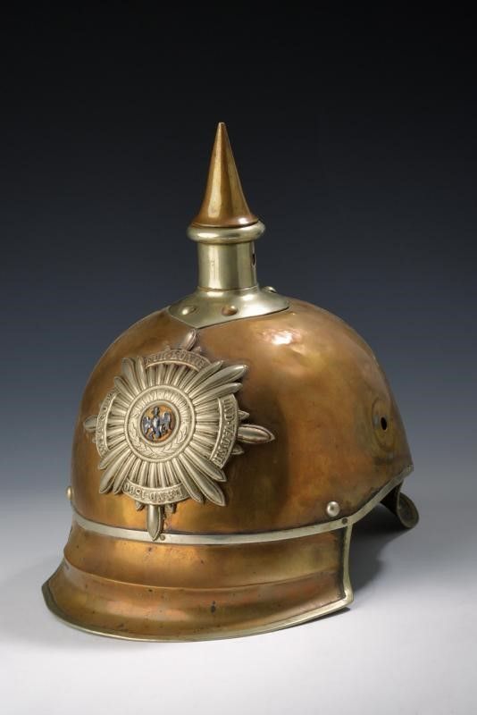 Prussia, altezza 28 cm. ultimo quarto del XIX Sec. Coppo, visiera e gronda in tombacco, bordi in argento; la sommità con puntale in tombacco su base ovale in metallo bianco; sulla fronte una grande stella dell'aquila nera, annerita al centro; mancano i soggoli e l'interno. Difetti.