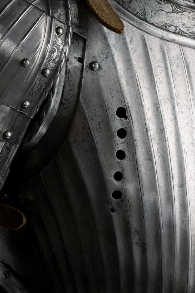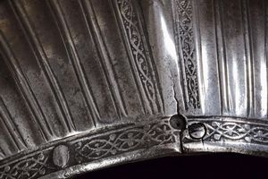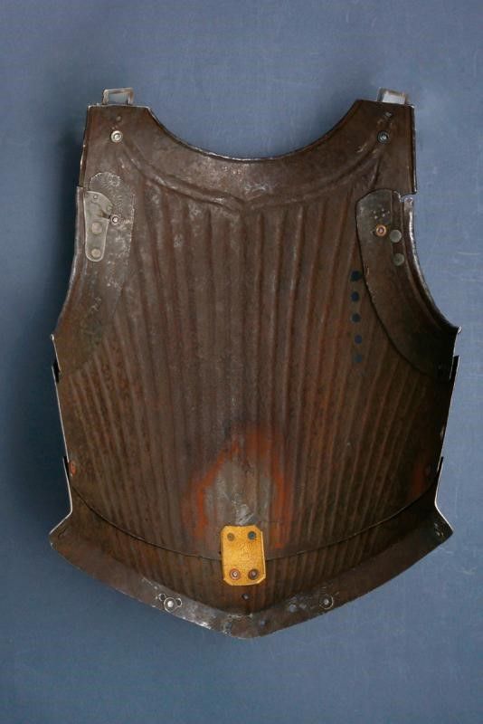 Anche la schiena realizzata in due pezzi, con fitta lavorazione sgusciata; la parte superiore en suite con il petto, i giri ascellari ribassati e con bordo rilevato e lavorato a fingere il tortiglione, la base della placca inferiore con banda incisa; lama di batticulo rivettata e lavorata nel solito modo.