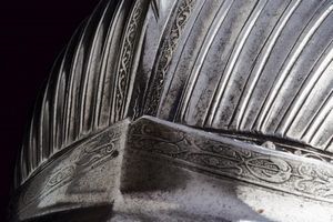 1520 circa Borgognotta con coppo martellato in un singolo pezzo, dotata di bassa cresta con profonde tacche a fingere il tortiglione. La parte superiore del coppo percorsa sgusci che corrono longitudinalmente; i due sgusci che costeggiano la base della cresta e il bordo anteriore del coppo incisi a volute su fondo nero granulato. La nuca, dove convergono gli sgusci, percorsa trasversalmente una banda dentata decorata con gigli. Tesa rialzabile, appuntita, costolata e in mezzeria, con lista ribassata e bordo lavorato a fingere il tortiglione, ornata su tutti i margini con una banda incisa. Guanciali mobili, con margine decorato en suite e con bordo inferiore lavorato a fingere il tortiglione. La lama di gronda lavorata en suite. Il retro del coppo con due fori per la pennacchiera (mancante).