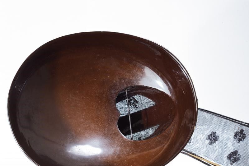 Giappone, altezza 18 cm. Periodo Edo (1603-1867) Copricapo indossato dai membri adulti del kuge (la classe sociale dei nobili) e del buke (la classe dei bushi, i samurai) in Giappone. Struttura rigida rivestita di tessuto nero decorato con Konoe-mon. La parte anteriore con apertura ad ospitare un velo lavorato e decorato en suite (piccoli danni). La parte interna laccata color marrone con apertura di aerazione. In astuccio di legno. Tardo periodo Edo. Raro.
