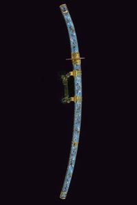 Giappone, lunghezza total 92 cm. 1880 circa Bellissimo koshirae con smalti policromi raffiguranti draghi e fiorami su fondo celeste. Tsuba in rame dorato decorata en suite. Fornimenti per montatura tachi in ottone, riccamente incisi con draghi e fiorami. L'impugnatura con foro per la corda udenuki/o. Saya con ashi-ma completo di ashikawa. All'interno lama sostitutiva in legno. Molto raro.