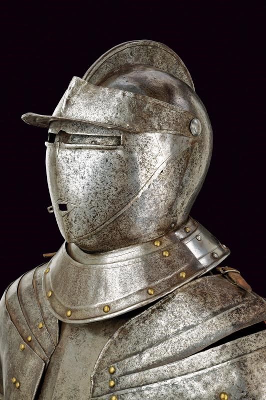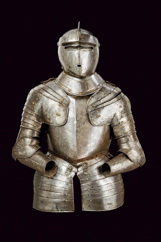 Europa, altezza 125 cm. inizio del XVII Sec. Con elmetto chiuso da corazza, coppo in due metà; frontale rialzabile con tesa appuntita e con margine a lista ribassata; ventaglia con fessure oculari (una mancanza al centro), un altro foro d'aerazione all'altezza della bocca; barbozza; due lame di gronda (una di restauro) e due di guardacollo, quelle più esterne con giro di ribattini. Petto costolato, schiena liscia scanalata al centro. Goletta a due lame. Spallacci a otto lame lisce, con ribattini in ottone. Bracciali dotati di cubitiere costolate e con piegature; antibracci a due lame. Scarselle formate da sei piastre, le ultime ribadite. I bordi con cordonature lisce.