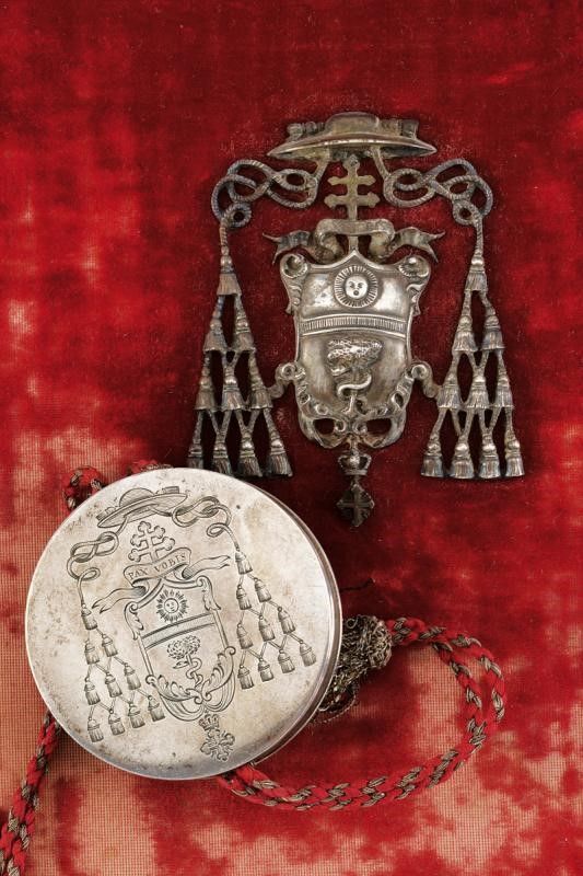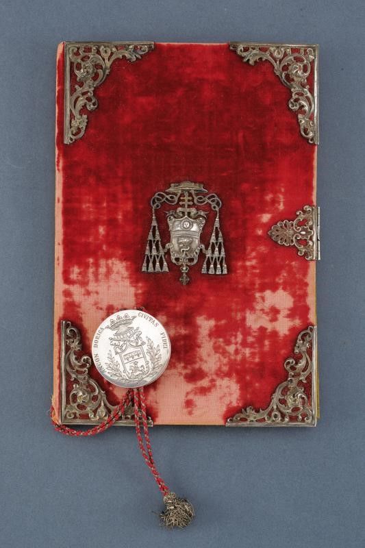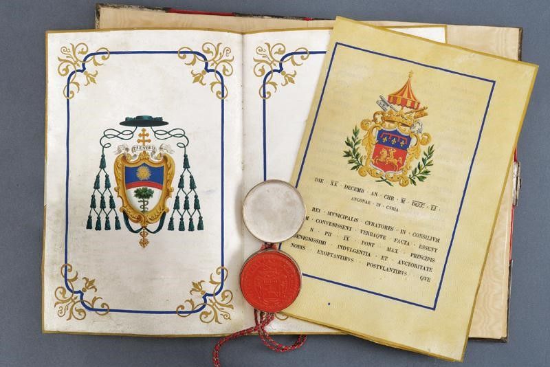 Ancona, dimensioni 18.5 x 27 cm. 1851 Rara nomina ad arcivescovo (galero con 10 nappe) di Antonio Benedetto Antonucci. Bella custodia in raso rosso (zone lise e mancanze) adornata con fornimenti in argento traforati ed incisi a motivi floreali; si presenta come una cornice a libro di grande eleganza, nella parte centrale della copertina, una placca in argento reca l'emblema araldico dell'arcivescovo, nella parte opposta il simbolo della città di Ancona. All'interno due pergamene. La prima con bellissima raffigurazione in policromia del galero ecclesiastico verde a dieci nappe, nella parte centrale scudo con sole e albero, i bordi dipinti color blu e oro. L'altra pregamena con la nomina scritta e il simbolo della città di Ancona. Di seguito un piccolo estratto: 'Rei mvnicipalis cvratores in consilivm cvm convenissent verbaqve facta essent d n pii pont max principis benignissimi indvlgentia et avcatoritate nobis exoptantibvs postvlantibvs qve concessvm atqve adtribvtvm vti ad ornandam vitrvtem antonii benedicti antonvcci civitatis n episcopi qvem preacipvvm honorem amplissimo cviqve praestare possvmvs eidem ivre optimo decernamvs decretvm in haec verba perscribi placvit ........'. Infine la bolla in ceralacca entro custodia d'argento; una faccia incisa con il motto della città di Ancona 'ANCON DORICA CIVITAS FIDEI'.