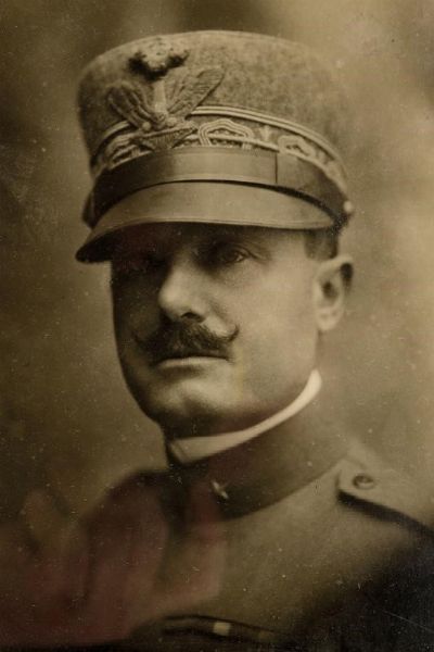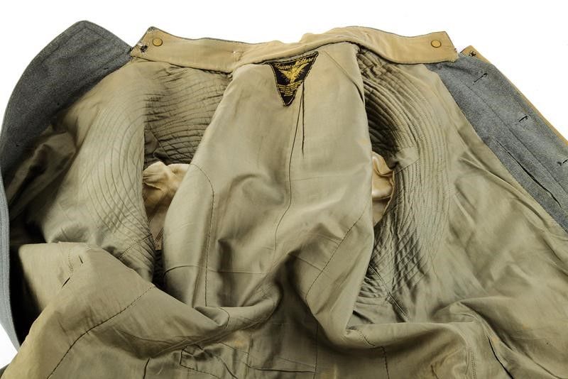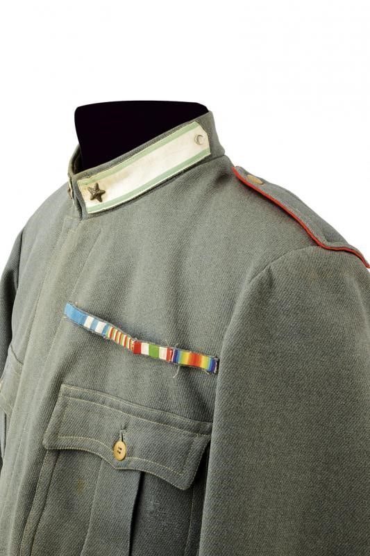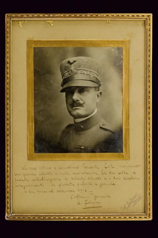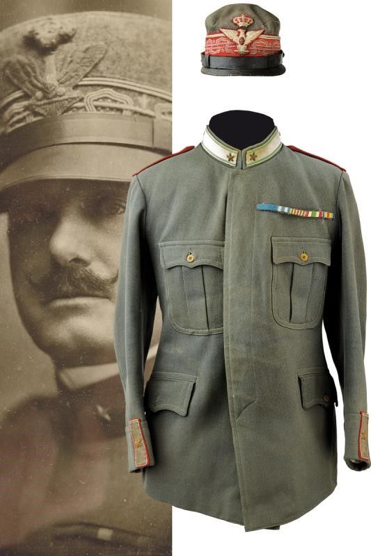 Regno d'Italia, altezza (jacket) 77 cm. 1914-18 Berretto in tessuto grigio verde (qualche buco da tarme), completo di aquila, corona e fascia ricamate; piccoli difetti; completo di soggolo su bottoni in argento; all'interno alluda in pelle e cuffia in seta celeste con timbro in oro dell'unione militare. Giubba in panno grigioverde, completa di effetti e nastro per cinque medaglie. Insieme una fotografia e dedica del generale (Filippini) indirizzata ad un suo tenente; probabilmente mai inviata; in cornice e sotto vetro.