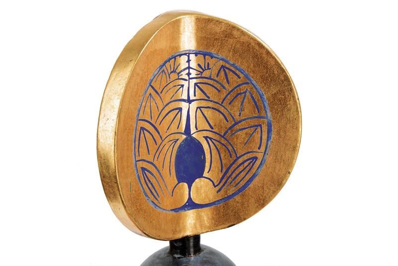 Giappone, altezza 37 cm. Periodo Edo (1603-1867) Realizzato in legno laccato nero e dorato. L'elemento superiore a tre facce concave decorate con il mon 'Daki-Myouga'. La parte centrale di forma sferoide è colorata in grigio metallico. L'elemento inferiore a forma di cupola in legno dorato, decorato con un motivo a onde in rilievo in tecnica 'Itchin' e munito di 10 Baren (nappe) scarlatte.