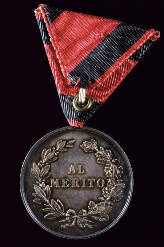 1862 Medaglia al merito. In argento. Al dritto busto di Ferdinando a sinistra, con iscrizione 'FERDINANDO IV GRANDUCA DI TOSCANA', in basso 1862. Al verso 'AL MERITO'. Con nastro triangolare. Molto rara.