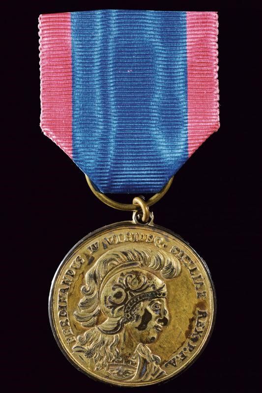 Regno delle Due Sicilie, diametro 3.6 cm. 1797 Medaglia al valor militare, in bronzo dorato. Al dritto busto corazzato a destra con elmo piumato e mantello, attorniato dall'iscrizione 'FERDINANDVS IV UTRIUSQ. SICILIAE REX P.F.A.'. Opus 'Morghen'. Al rovescio soldato in piedi, volto a destra, regge scu