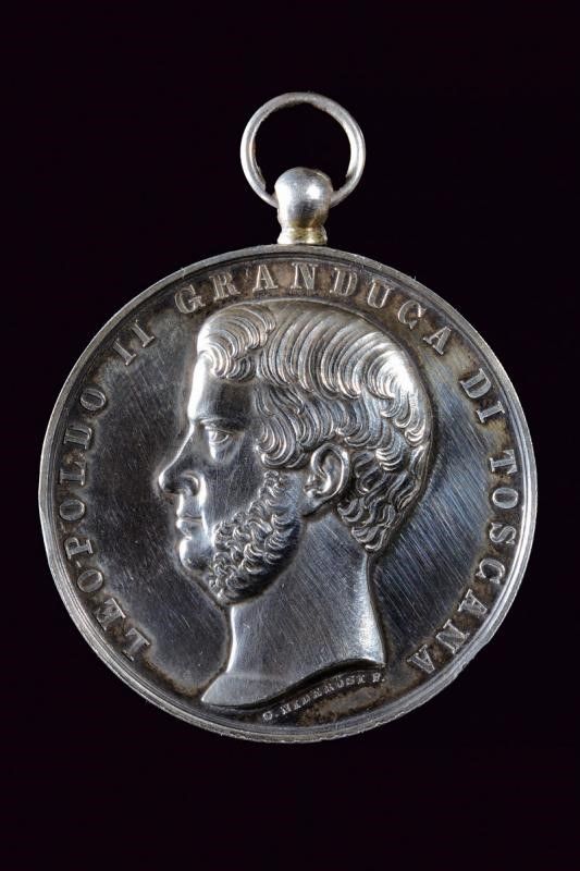 Granducato di Toscana, dimensioni 4.1 cm. 1848 Rara medaglia assegnata ai rappresentanti del senato, in carica dal gennaio 1849 al 21 settembre 1850. In argento. Al dritto busto verso sinistra con attorno l'iscrizione 'LEOPOLDO II GRANDUCA DI TOSCANA'; opus 'G. NIDERÖST F.' Al rovescio, entro corona d
