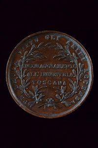 Granducato di Toscana, diametro 4.5 cm. 1854 Medaglia in bronzo, premio d'incoraggiamento all’industria toscana. Al dritto testa a sinistra ed iscrizione 'LEOPOLDO II GRANDUCA DI TOSCANA'. All'esergo 'G. NIDEROST F.'. Al rovescio 'INCORAGGIAMENTO ALL'INDUSTRIA TOSCANA' e intorno 'UN' EMULA VIRTU GLI