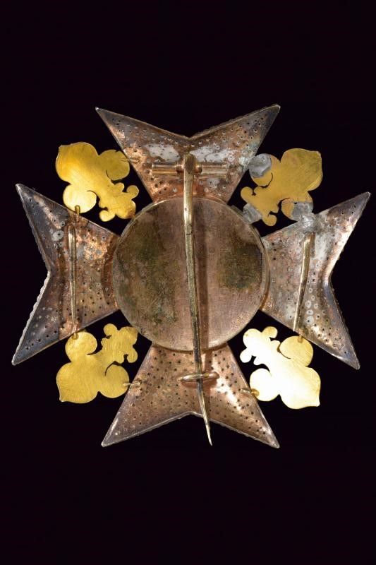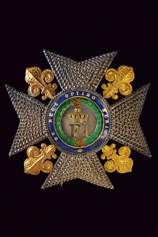 Regno delle Due Sicilie, dimensioni 7.5 x 7.5 cm. 1829 - 1860 Placca di gran croce. In argento e oro, la croce brillantata e traforata, il monogramma centrale su fondo finemente zigrinato. Restauro all'attacco di uno dei gigli. Sul retro spilla verticale e due ganci laterali.