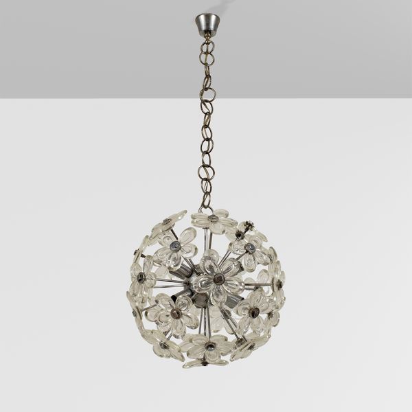 anni 70 lampada a sospensione mod. Sputnik in metallo cromato e vetro trasparente, mancanze e lievi usure
