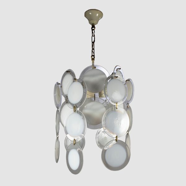 Murano, anni 60-70 lampada a sospensione in metallo verniciato, ottone, vetro trasparente e vetro lattimo