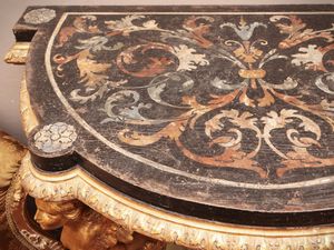 h cm 111x122x67 seconda metà del XX secolo laccato verde acqua e lumeggiato in oro, piano sagomato in legno ebanizzato dipinto ad imitazione della scagliola, sostegni anteriori modellati come due figure antropomorfe, alate con finali a voluta, colonna centrale, base sagomata