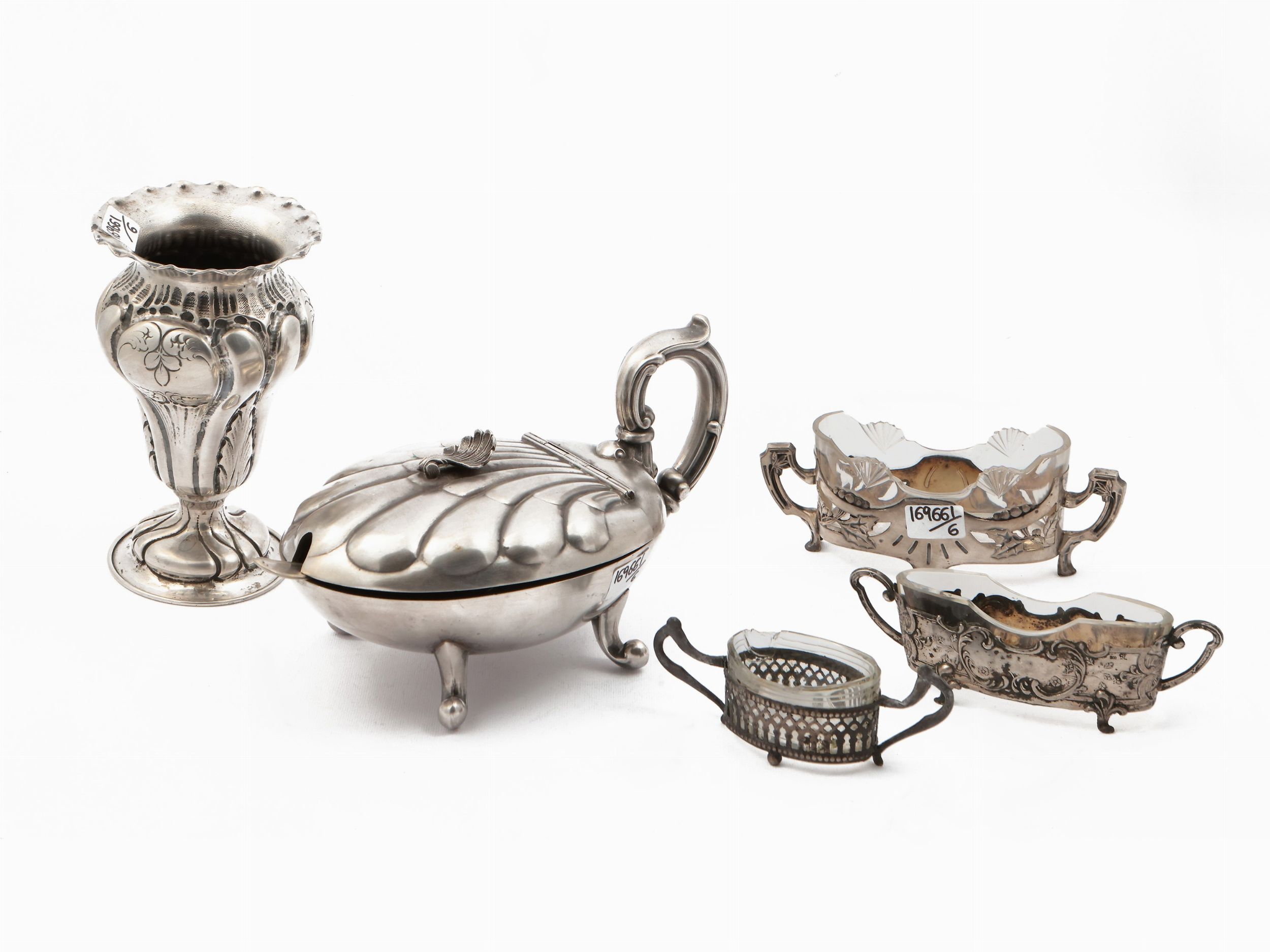 gr netti 480, h da cm 4 a cm 14 (6) prima metà del XX secolo composto da una formaggiera sbalzata con motivo a conchiglia, corredata da cucchiaino, un piccolo vaso da fiori baccellato e cesellato con motivo floreale ed una serie di tre saliere con interno in vetro