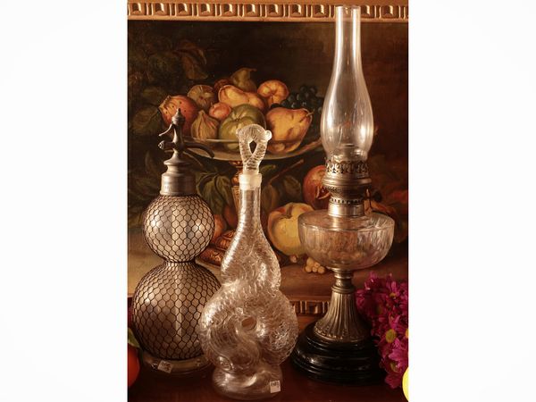 XIX/XX secolo tra cui un lume a olio in vetro e metallo argentato ed una bottiglia in vetro soffiato modellata come delfini barocchi intrecciati