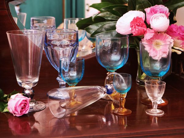 composta da un servito nei toni del turchese e dell'ambra, completo per sei persone con 6 calici da acqua, 6 da vino rosso, 6 da vino bianco ed un assortimento di bicchierini da liquore di più gradazioni, abbinato ad una serie di 12 calici in vetro azzurro