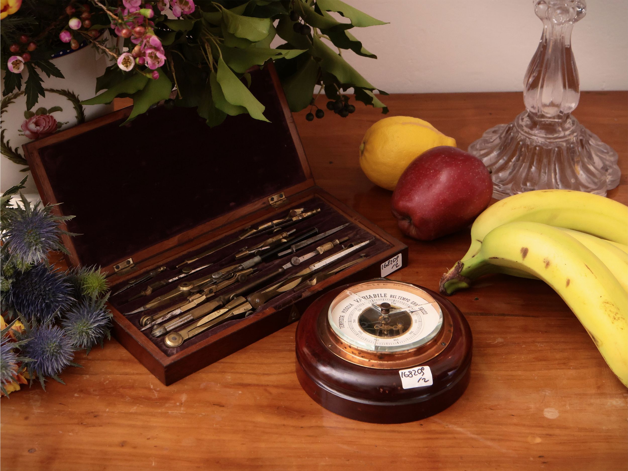 XIX/XX secolo una scatola in mogano contenente compassi con accessori (possibili mancanze), ed un barometro, alcuni difetti
