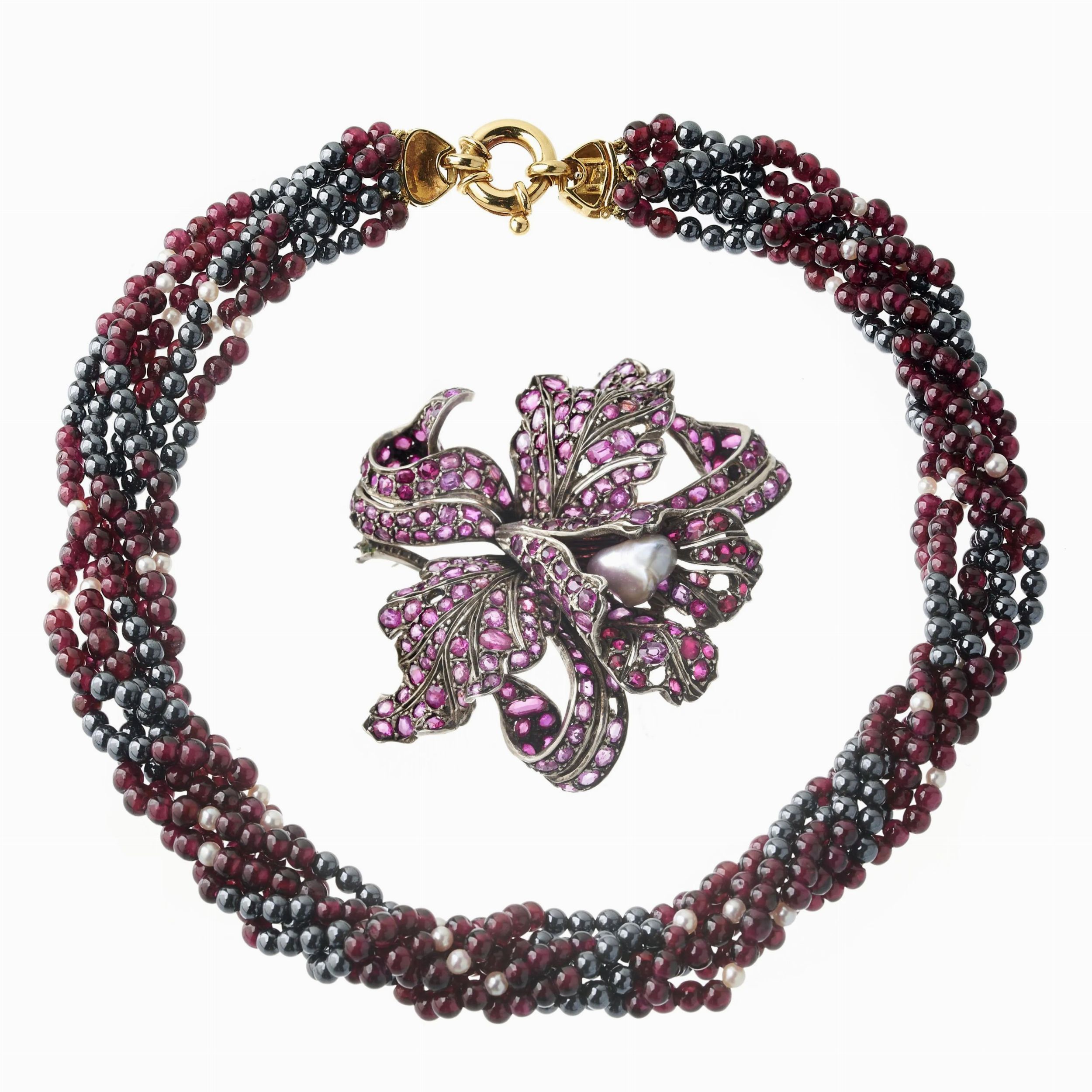COLLANA TORCHON CON PIETRE SEMIPREZIOSE E GRANDE SPILLA A FORMA DI FIORE