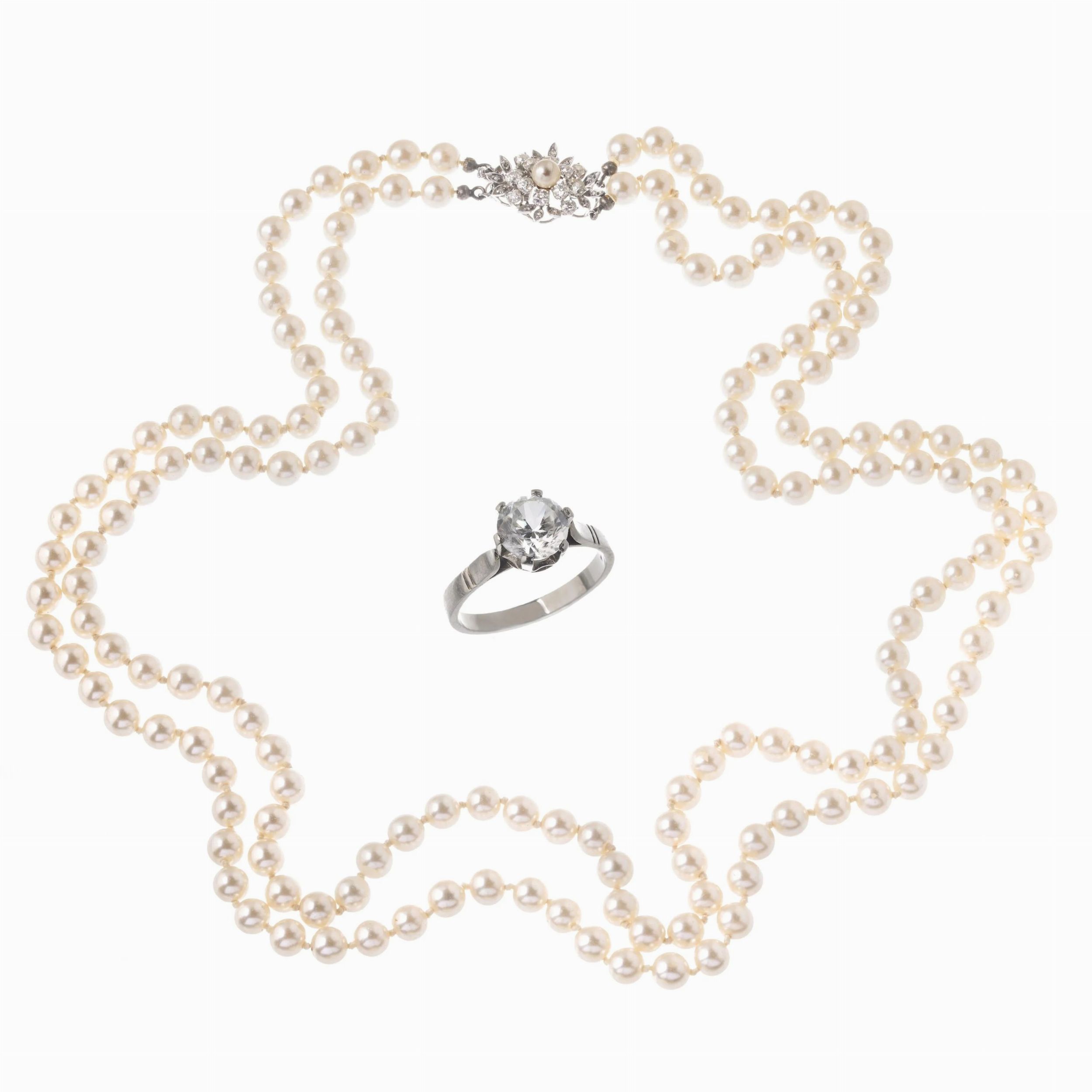 LUNGA COLLANA CON IMITAZIONE DI PERLE E ANELLO realizzata a doppio filo di sfere di mm 7 circa, fermatura in oro bianco 18kt impreziosita da diamanti taglio vecchio (uno mancante) per ct 2 circa, lungh. cm 74,5, gr. 108; accompagnata da un anello solitario in oro bianco 18kt, pietra sintetica taglio brillante, punzone 750, mis. 14/54, gr. 3