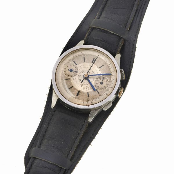 cassa in acciaio staybrite, fondello a pressione, anse fisse, tasti del crono rettangolari, quadrante argentè ristampato, grafica nera, due contatori, indici stampati, movimento a carica manuale, cinturino in pelle nera con polsino e fibbia in metallo non originali, vetro plastica. Diam. mm 35