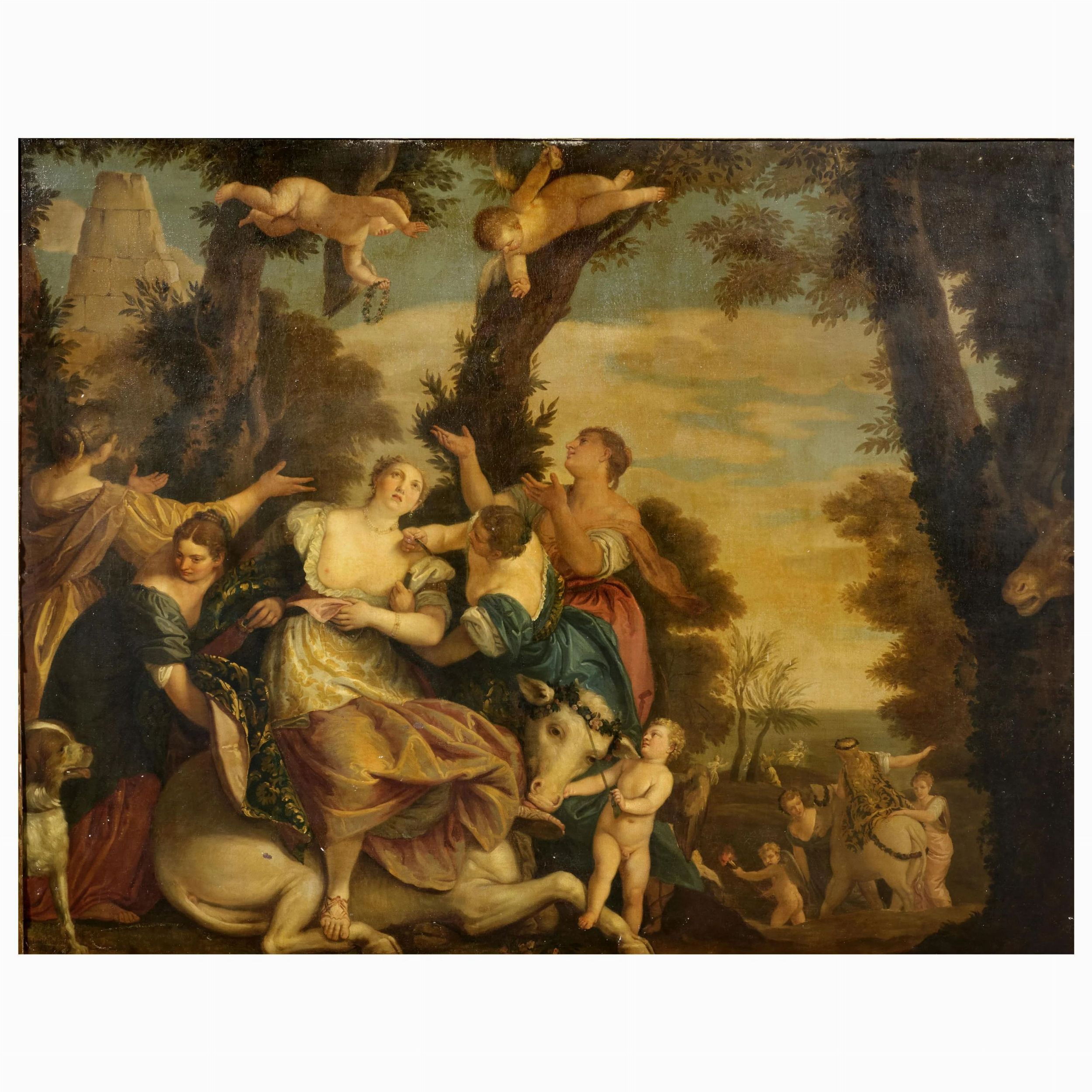 THE ABDUCTION OF EUROPA oil on canvas, 136x151.5 cm signed and dated '1617' lower left L’opera qui presentata è una fedele copia di pregevole qualità della tela del padre Paolo Caliari, detto il Veronese (1528-1588), realizzata verso il 1580 circa e conservata presso la Pinacoteca dei Musei Capitolini a Roma.