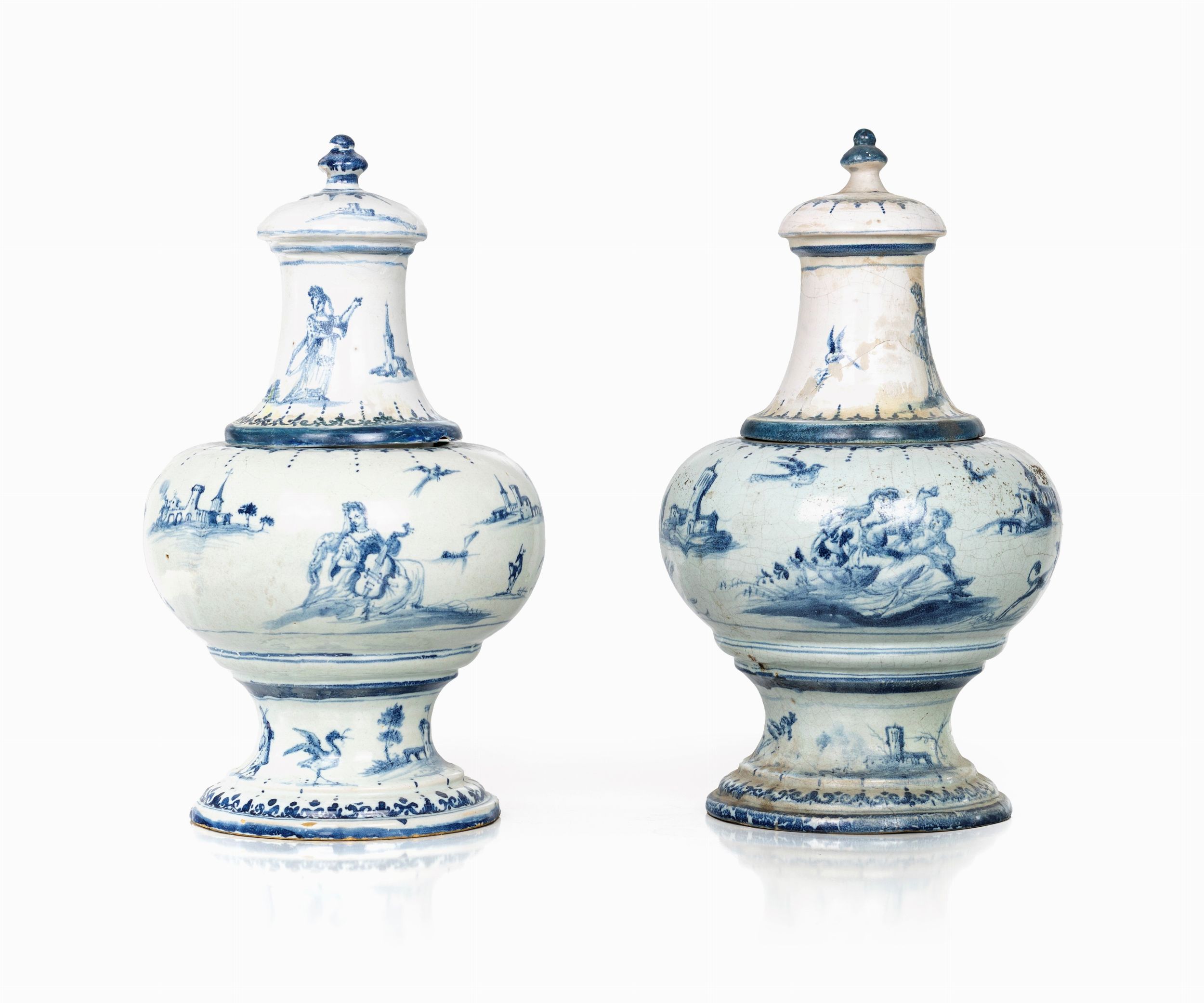 Coppia di vasi con coperchio in maiolica bianca e blu, Liguria, XVIII secolo