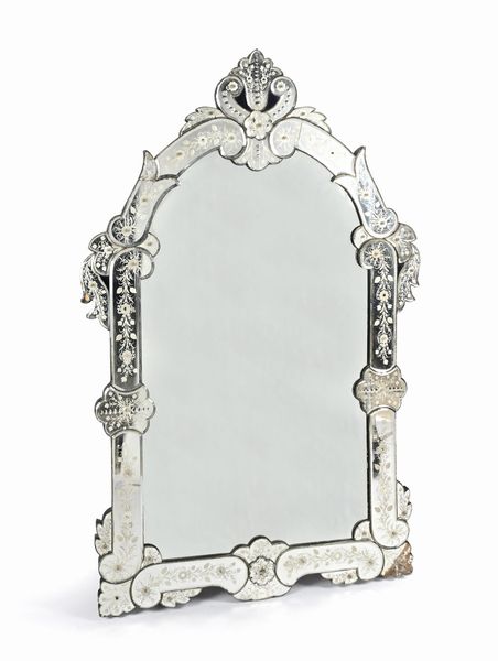 cornice centinata costituita da elementi sagomati in specchio con decorazione incisa a motivi naturalistici e cascatelle