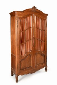 cimasa centinata centrata da rilievi vegetali intagliati, due ante frontali con pannelli sagomati a vetri e sottolineati da cornici modanata in incavo; grembiale curvilineo, piedi mossi terminanti a ricciolo