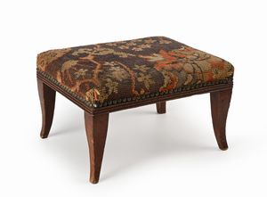 Poggiapiedi ovale in legno con rivestimenti a piccolo punto, XIX secolo