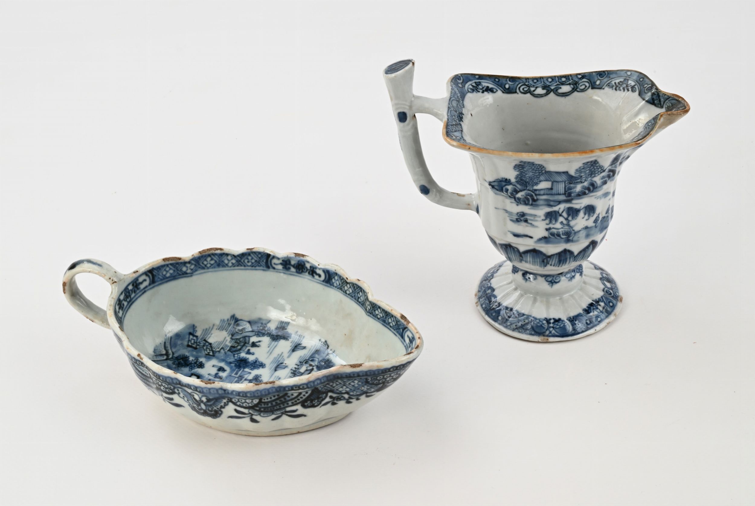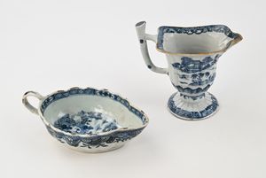 Salsiera a navicella e brocchetta in porcellana bianca e blu, Compagnia delle Indie, [..]