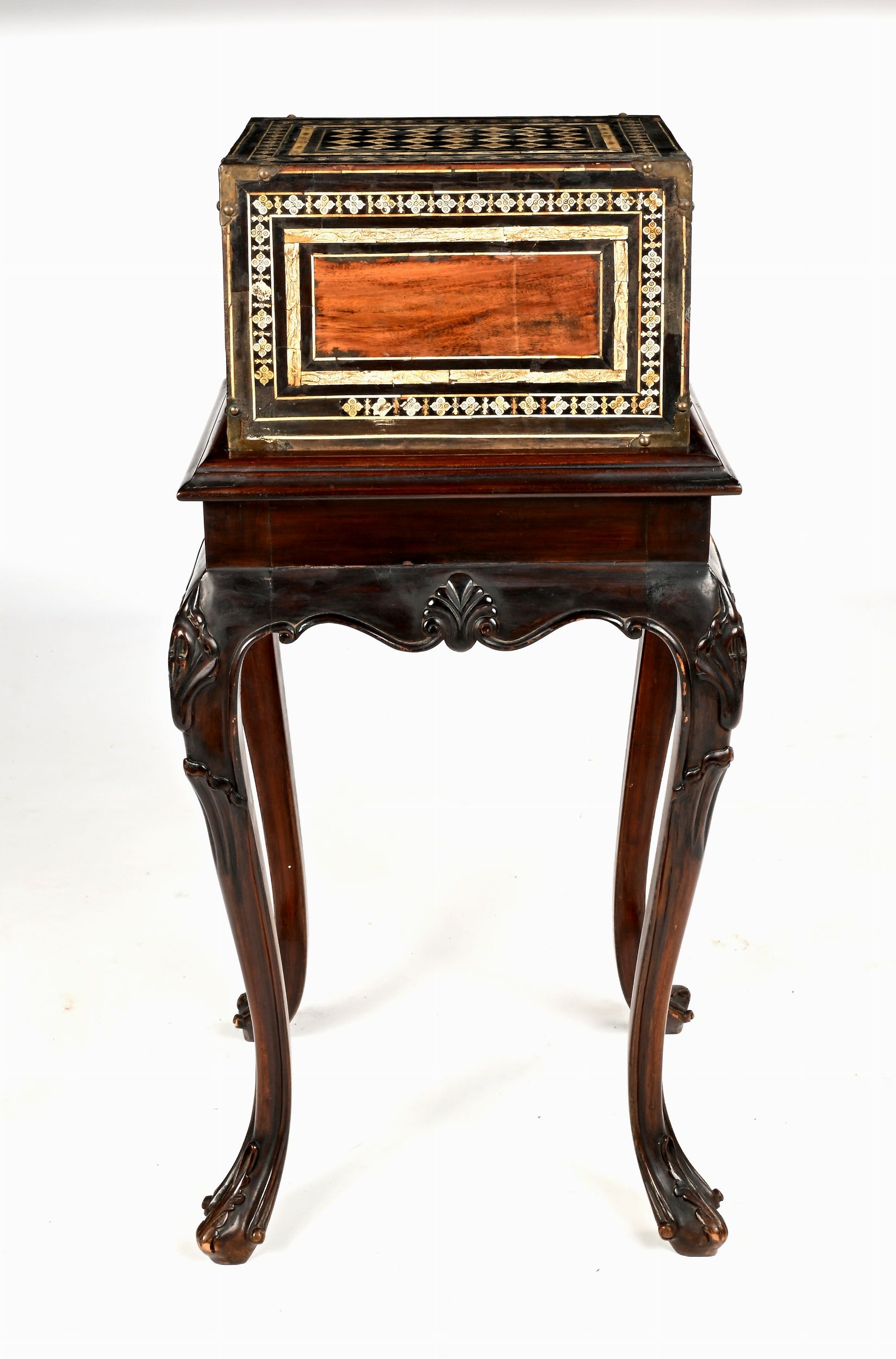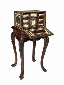 cm 25x40x29 - la base cm 75x48x38 anta frontale a ribalta con serratura in bronzo e formella centrale decorata da tre fiori recisi racchiusi da più ordini di cornici lineari ed intarsiate a motivi geometrici; analoga ripartizione è ripetuta sul piano superiore, al verso dell'anta frontale, ai fianchi e alla facciata posteriore. All'interno tiretti di diversa misura. Spigoli, serratura e maniglie laterali in ferro. Poggiante su tavolino non pertinente con ciglio modanato, fascia con profilo ondulato centrata da palmetta intagliata, gambe mosse