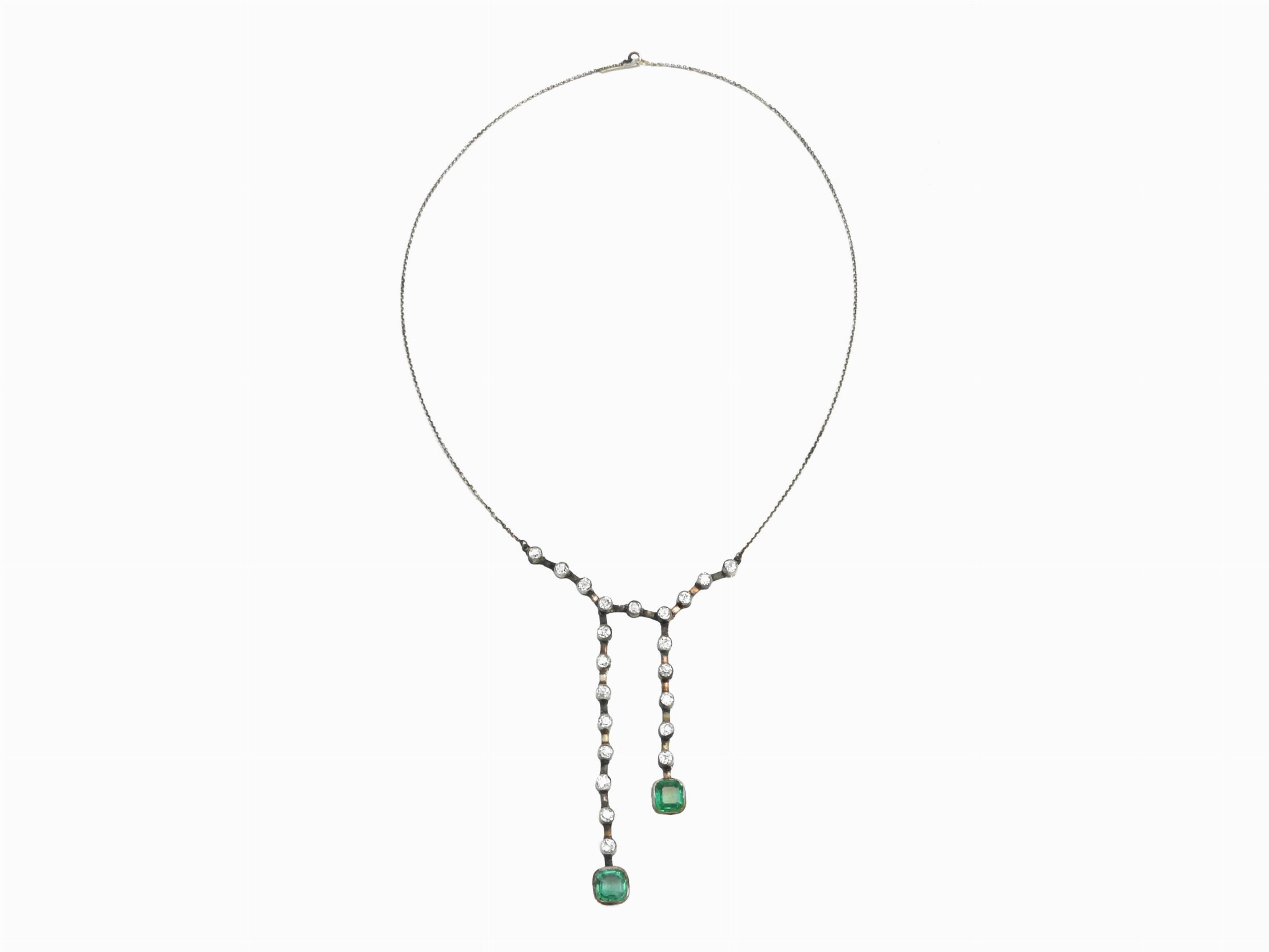 Collana négligé in oro giallo ed argento con diamanti e smeraldi