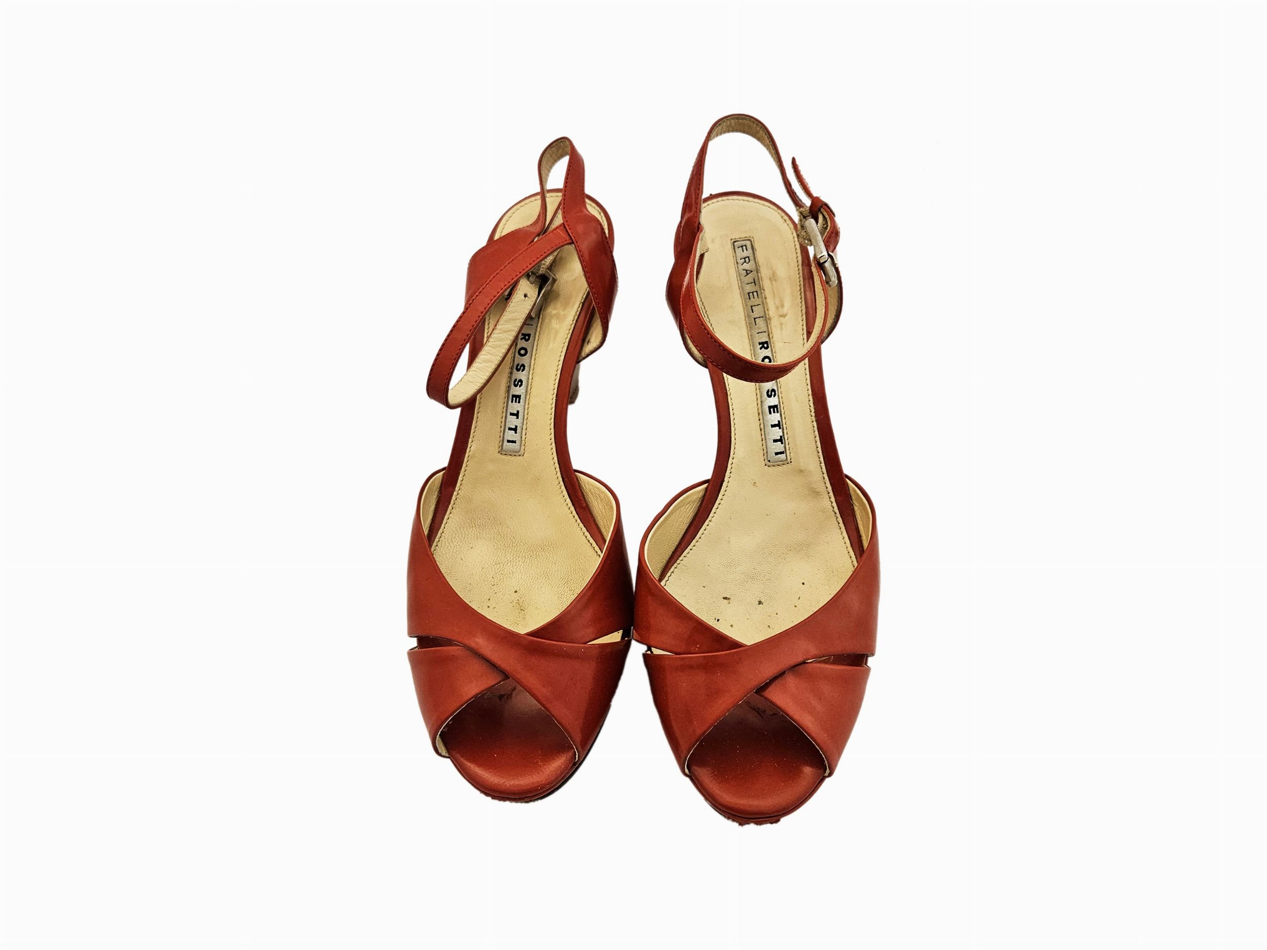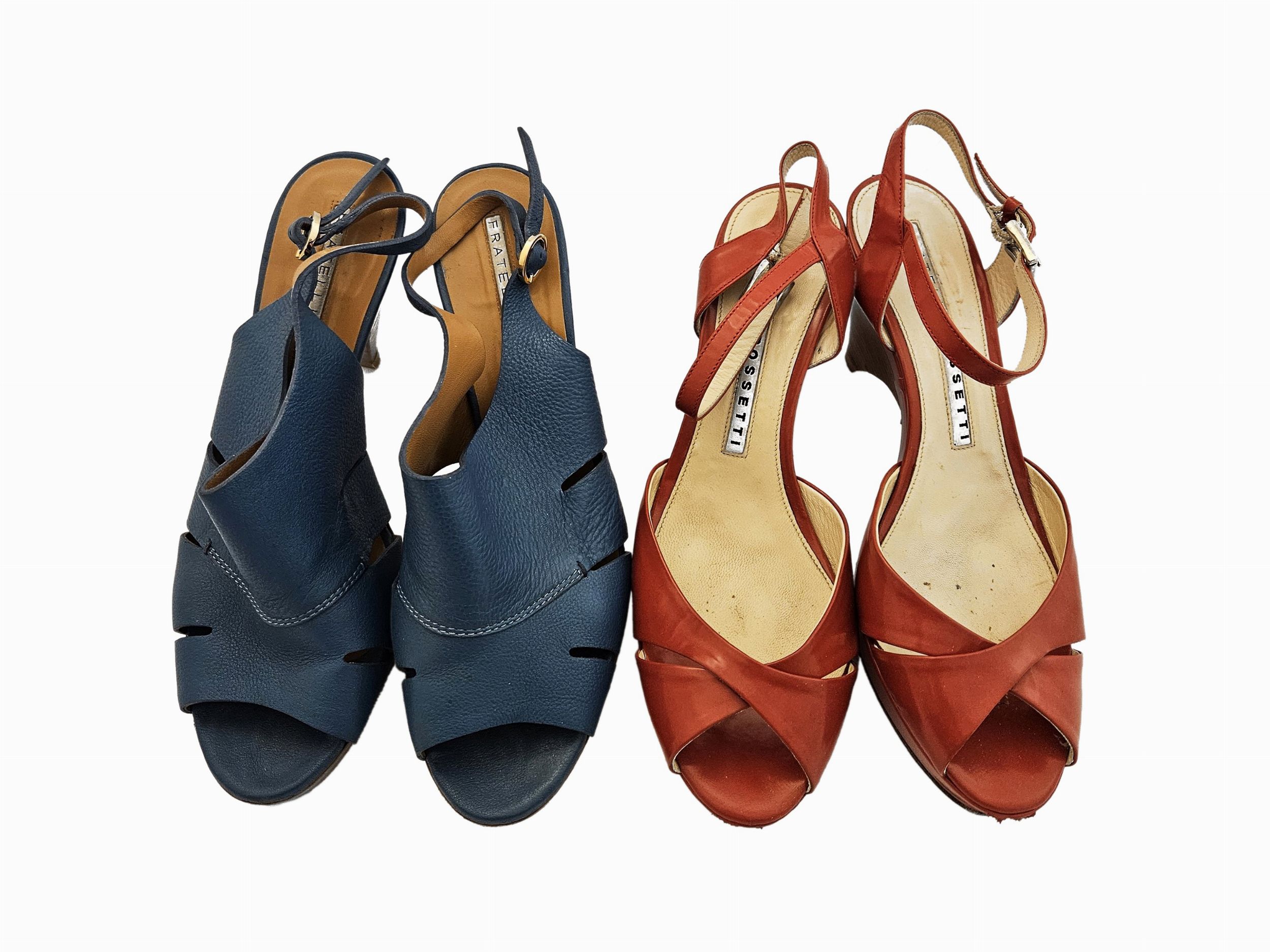 uno rosso con plateau e tacco 8, l'altro azzurro con plateau e tacco 10 a cono, lievi segni d'uso