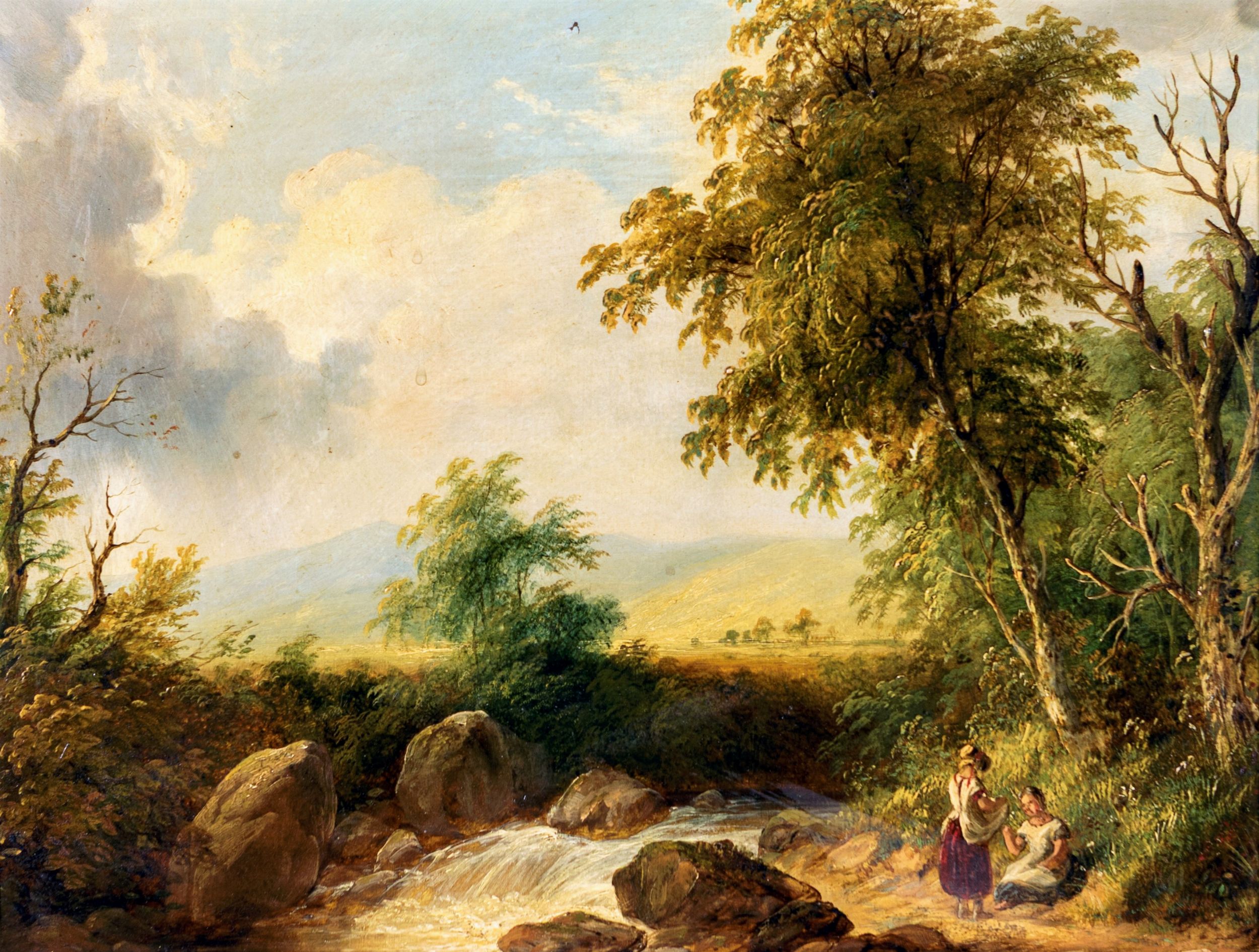 Due giovani donne in sosta presso un ruscello in un paesaggio di campagna